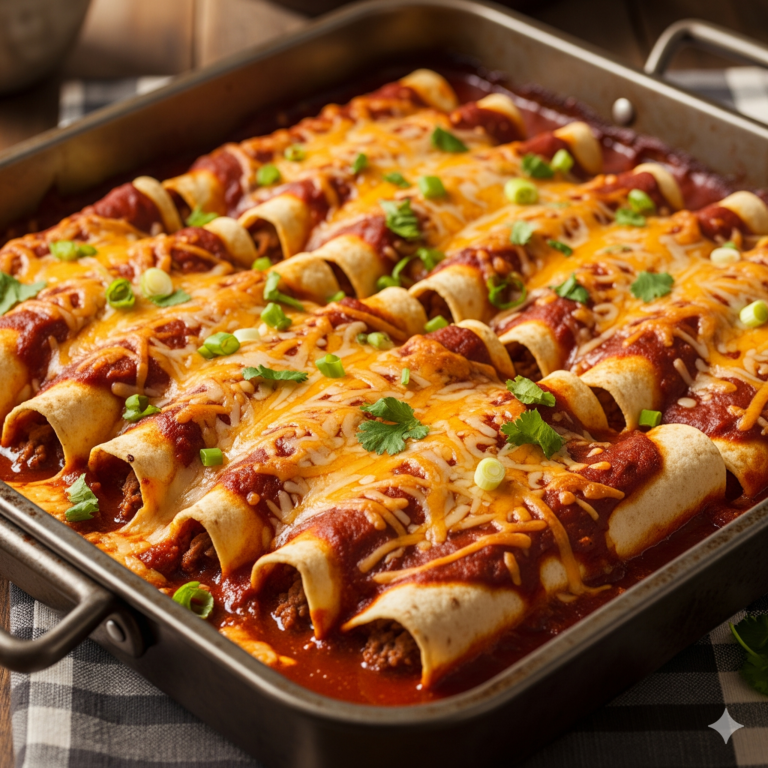 A crowd-pleasing favorite, perfect for your next big meal or gathering. We take soft corn tortillas and generously fill them with savory ground beef and a rich blend of Monterey Jack and cheddar cheeses. They are then rolled and smothered in our smoky red enchilada sauce, then baked until bubbling with cheesy goodness.